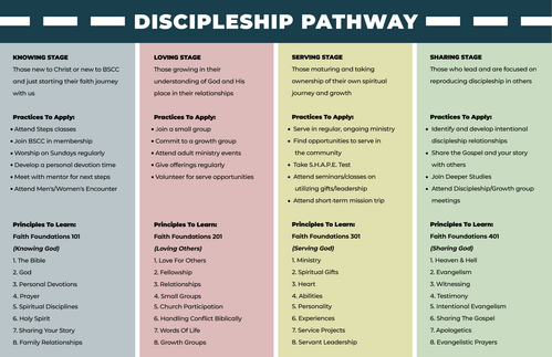 For those looking to grow in their devotion to Jesus, the Discipleship Pathway lists a clear path you can take that puts you in a position to grow. While we acknowledge that God determines all spiritual growth, we have found that taking the steps in this path has been helpful for many believers and can serve both as markers of maturity and goals to accomplish. Simply put, this puts the growth opportunities that we offer here at BSCC in a clear, simple frame of reference that anyone can understand. It should also clarify what next steps they should take if they want to grow spiritually.